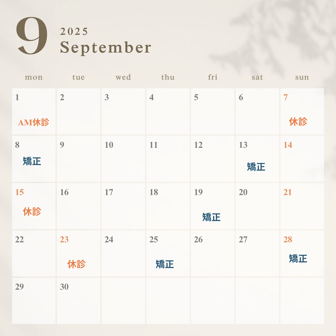 9月の休診日と矯正治療および歯並び無料相談の日程をお知らせいたします。